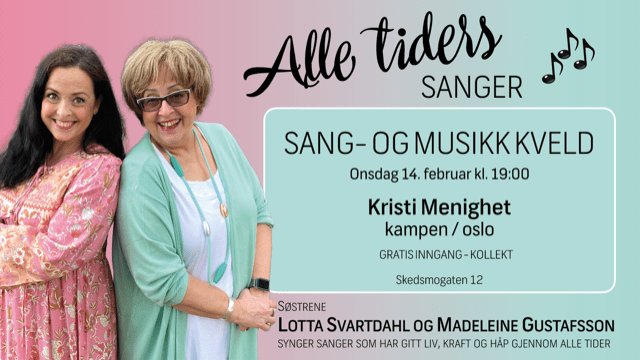 | Onsdag 14. Kl. 19.00 | Sang- og musikk kveld Alle tiders sanger Besøk av Lotta Svartdal og Madeleine Gustafsson. |